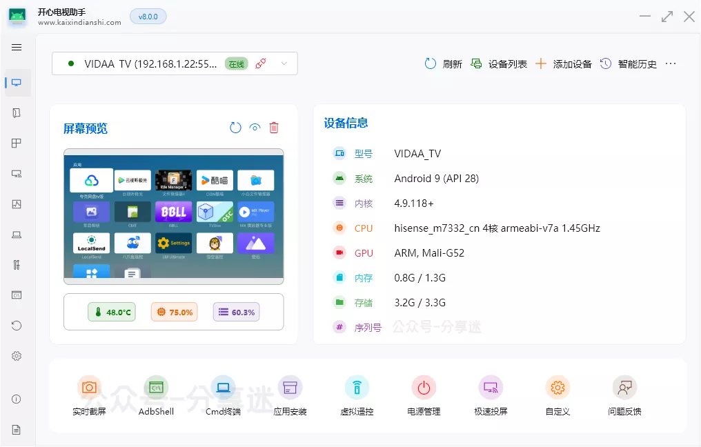 2. 便捷安装第三方APK,远程截图,虚拟遥控器,一键去广告,优化系统,更加稳定流畅,支持刷第三方ROM固件; 3. 支持自定义加载bat批处理、py脚本等插件,比如免拆批量刷盒子,一键备份机顶盒系统固件; 特色功能1. 图形化操作,小白也能轻松管理智能电视、电视盒子、投影仪等安卓设备;