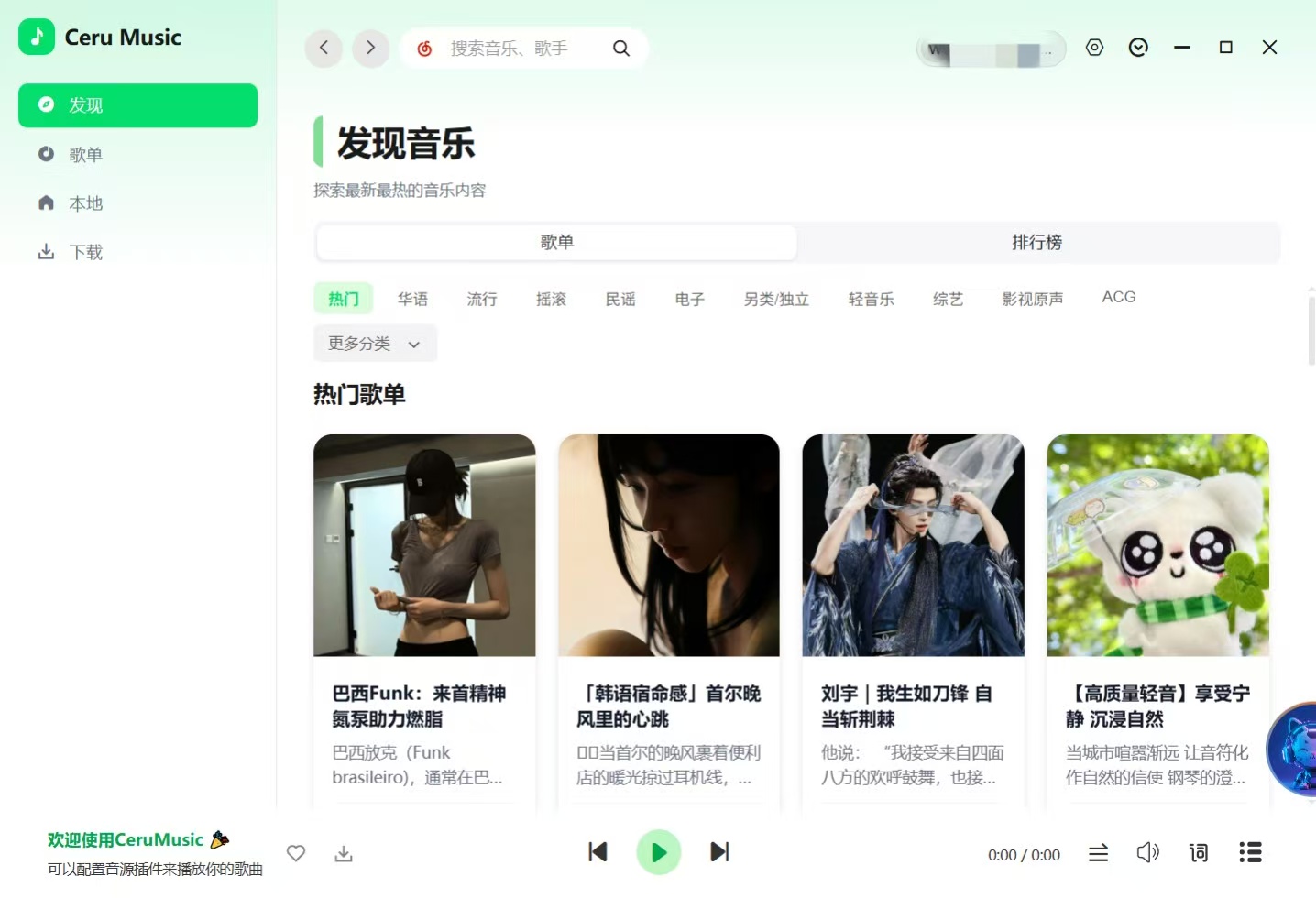 【软件介绍】:Ceru Music 是基于 Electron 和 Vue 开发的跨平台桌面音乐播放器工具,仅提供插件运行框架与播放功能,不直接存储、提供任何音乐源文件。