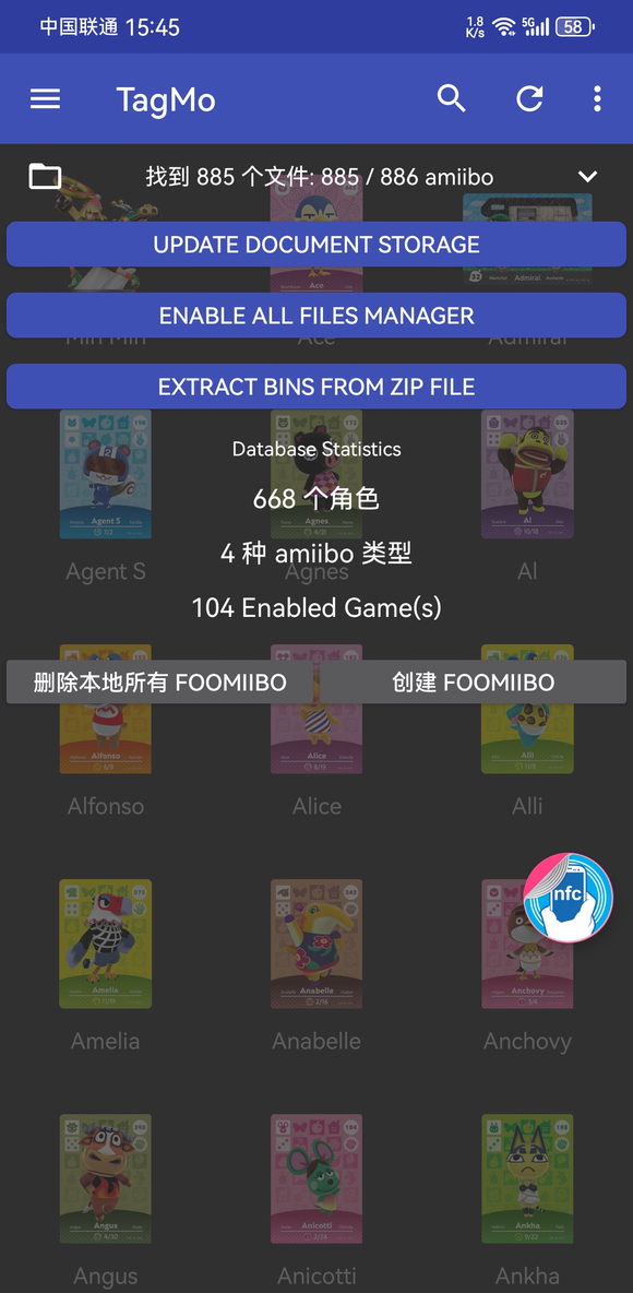 4.设置Amiibo本地数据库的目录,TagMo主界面下方 “文件夹”图标 位向上划拉,指定 本地Amiibo数据包压缩文件Amiibo Bins ZIP File (2024_09_05).zip所在的目录也就是你放在手机内存里的”!Essential Files“目录,压缩包不用解压,TagMo会自动扫到里面的 Amiiboo数据的,指定好目录扣,按一下创建FOOMIIBO, 压缩包里的886个Amiibo马上就可以全找到并以图标方式显示在主界面