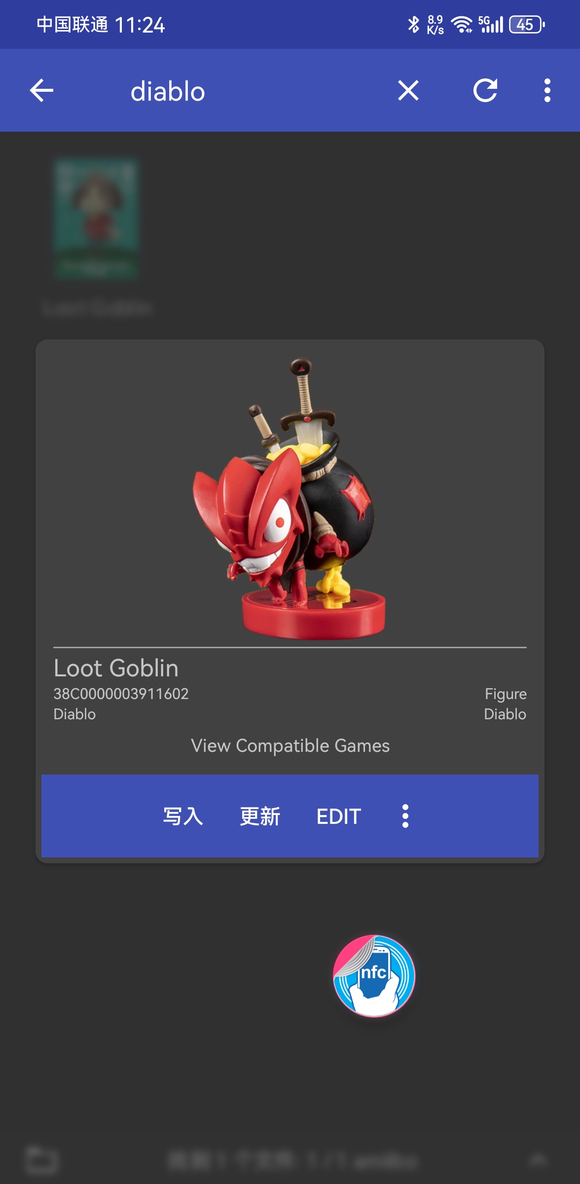 6.手机打开TagMo,找到你想刷的那个amiibo卡,比如我想做一张Diablo III的 Loot Goblin地精宝库副本的Amiibo卡,上面查找diabolo就出来了,这时 界面 按 写入, 把一张全新的 Ntag215白卡放在手机后背NFC感应区写卡,一会就写好了。