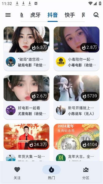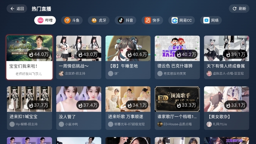 核心功能聚合观看 B站、斗鱼、虎牙、抖音等平台直播。支持添加自定义直播源。